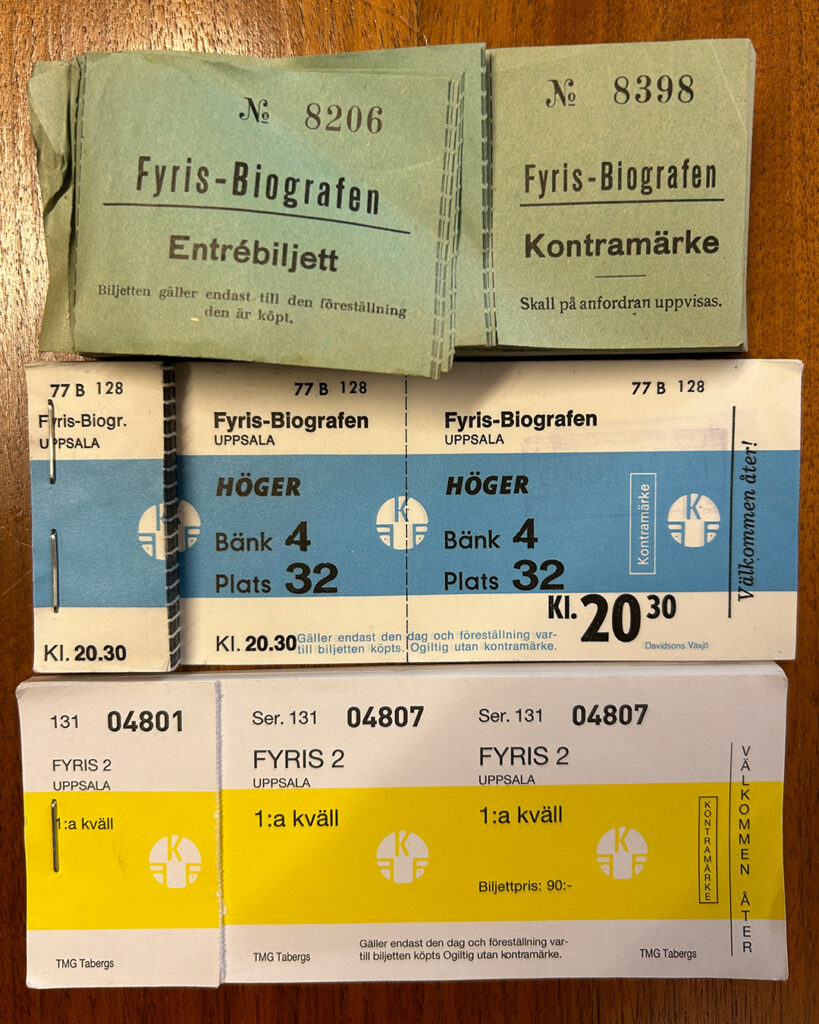 Neonskylten med “Fyris 1 och 2” som idag karakteriserar Fyrisbiografen kom inte upp förrän på nittiotalet när man bytte ut den orange skylten i plast som länge hade prytt fasaden. Karin berättar vidare att det innan dess hängt en handsågad skylt med texten “Fyris” ovanför ingången.