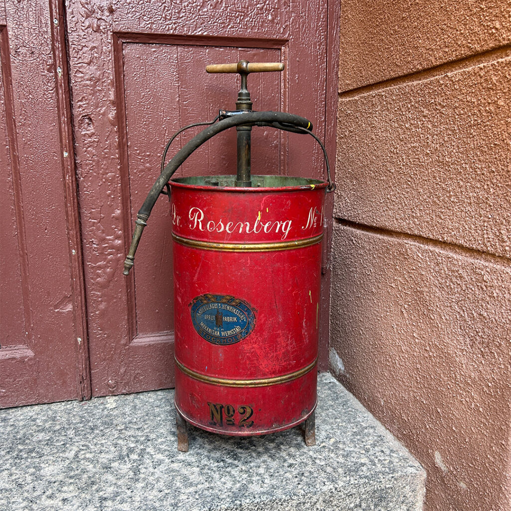 – Det här är en brandsläckare från början av 1900-talet, säger hon och berättar om nitratfilmen som användes i biograferna förr – som var både brandfarlig och extremt lättantändlig .
