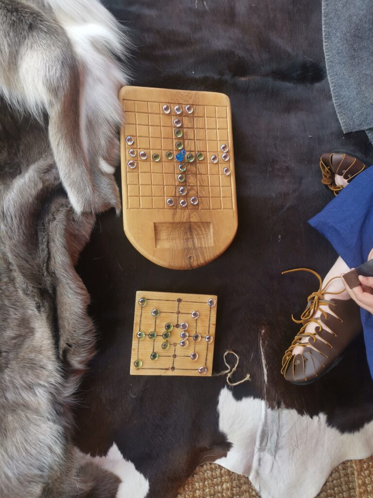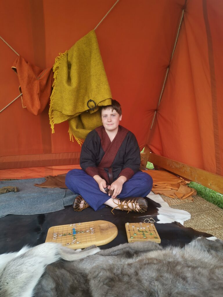 Jörgens son Jesper, 13 år, är också aktiv i föreningen och sitter i sitt tält med två spelbrickor. Det är vikingaspelen hnefatafl och kvarn. Jesper berättar att han ofta följer med pappa Jörgen på olika historiska träffar och festivaler.