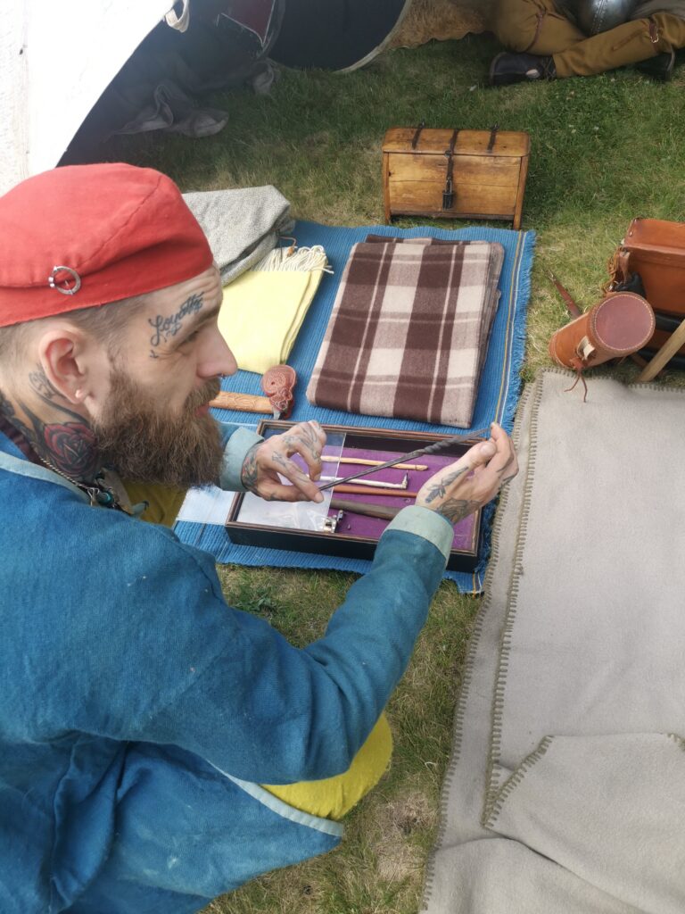 Sex tatuerare från Tyskland, Belgien och Nederländerna har precis anlänt till Uppsala från en liknande festival i Birka. Hos dem kan man göra riktiga tatueringar i vikingastil och de visar gärna upp fynd och replikor av tatueringsverktyg från olika tider och delar av världen.