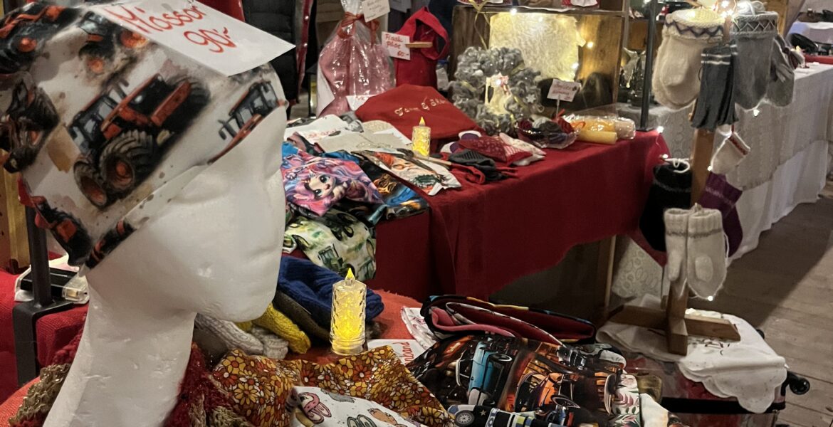 Det regnar även idag, men nästan alla knallar på julmarknaden befinner sig inomhus. Antingen är de på det mysiga och ombonade Kvarnloftet eller i den lika trevliga ”Sommarbutiken”. Och de har såväl lokalt producerade matvaror som hantverk, smycken, julpynt och mycket annat att erbjuda. Elin är med på julmarknaden för första gången.